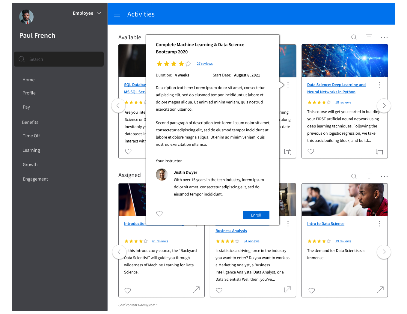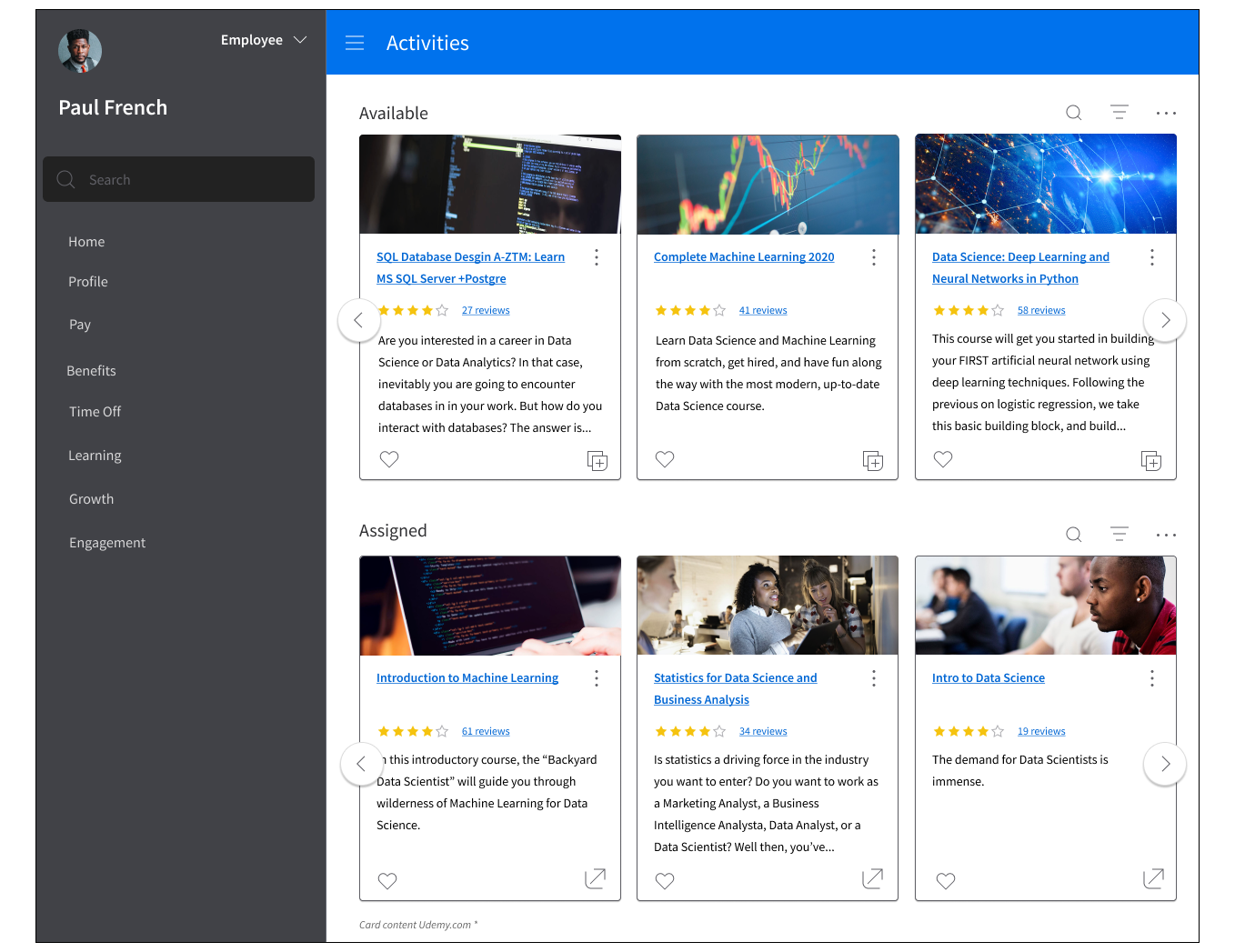In the Learning Management area of the product, activities and courses defaulted to displaying in tables, resulting in a very text-heavy experience. Viewing the available learning activities was lack-luster at best, and the Product Management team wanted to transform the experience of browsing learning activities through improving upon the UI.