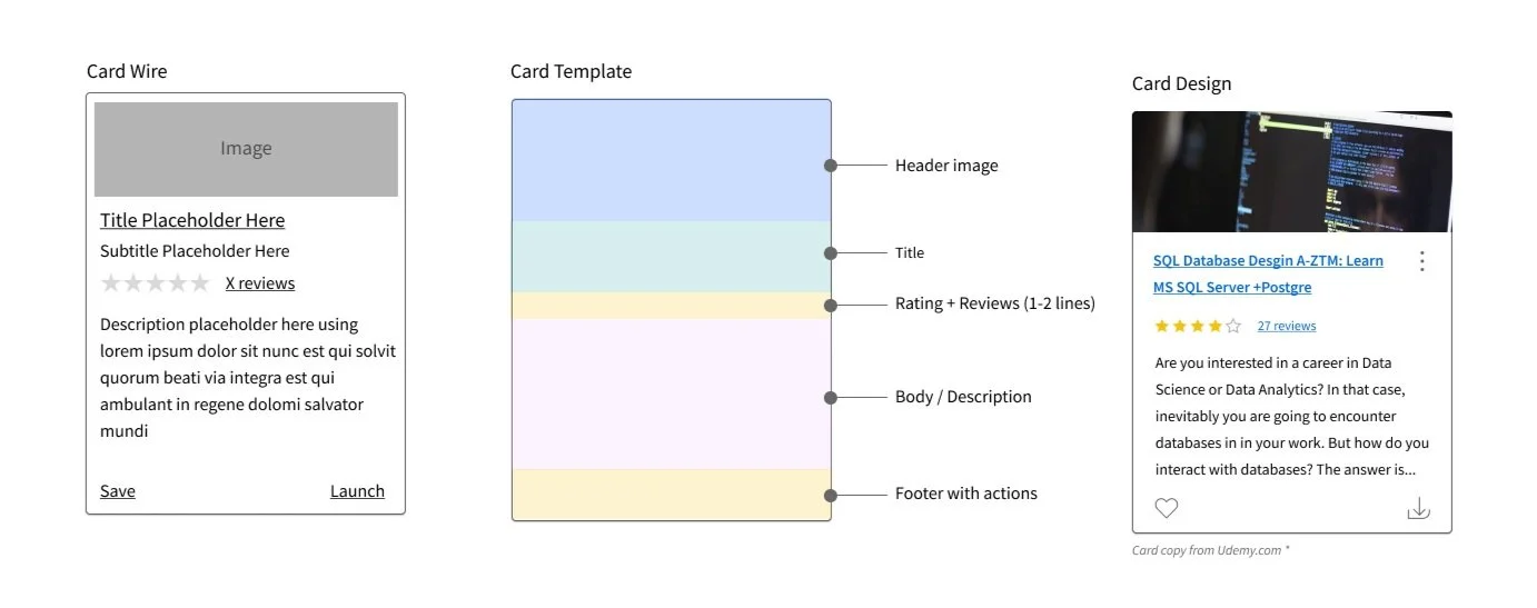 Product Management provided the requirements that they wished to include as part of the gallery view design for the learning activities. These included the following items: