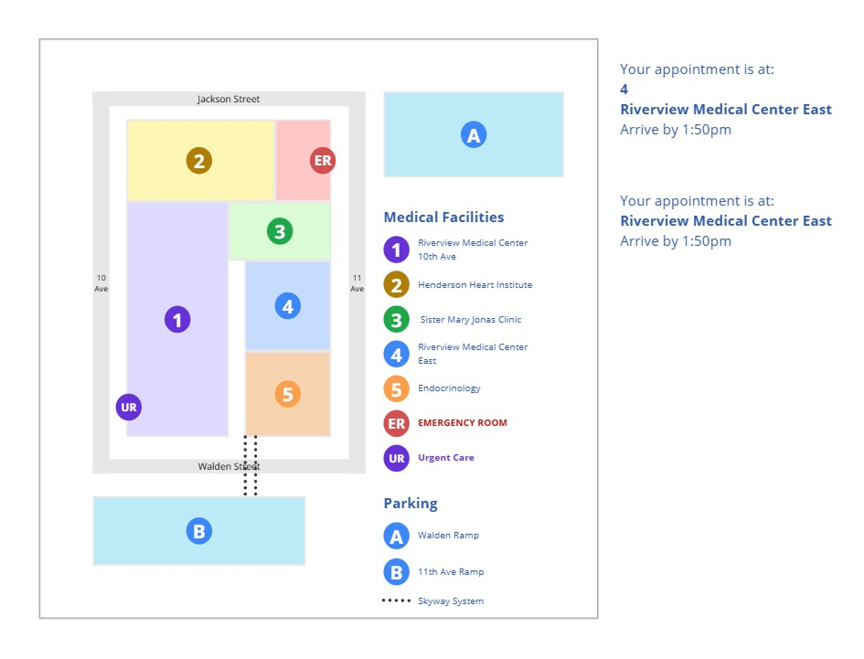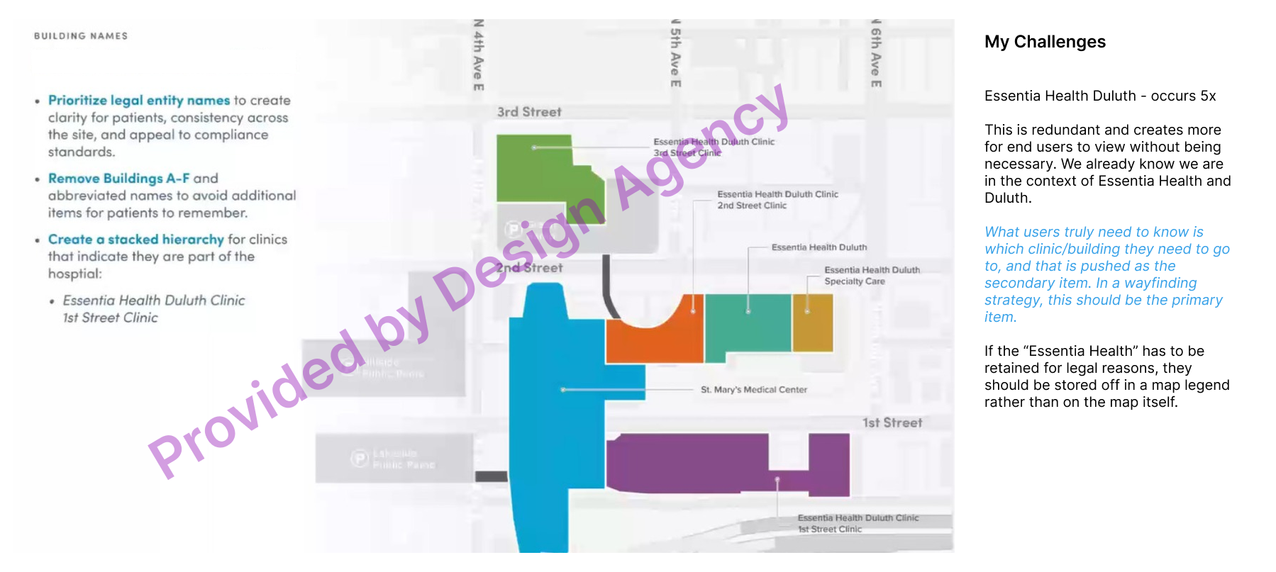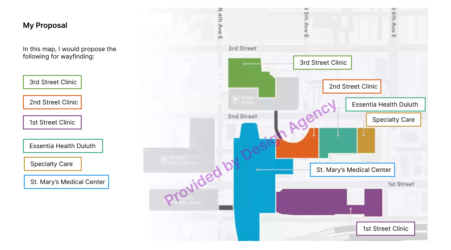 The Design Agency provided a simplified map for the healthcare campus. However, this map still included elements that increase cognitive load for users and are redundant in the context of the Essentia Healthcare environment.