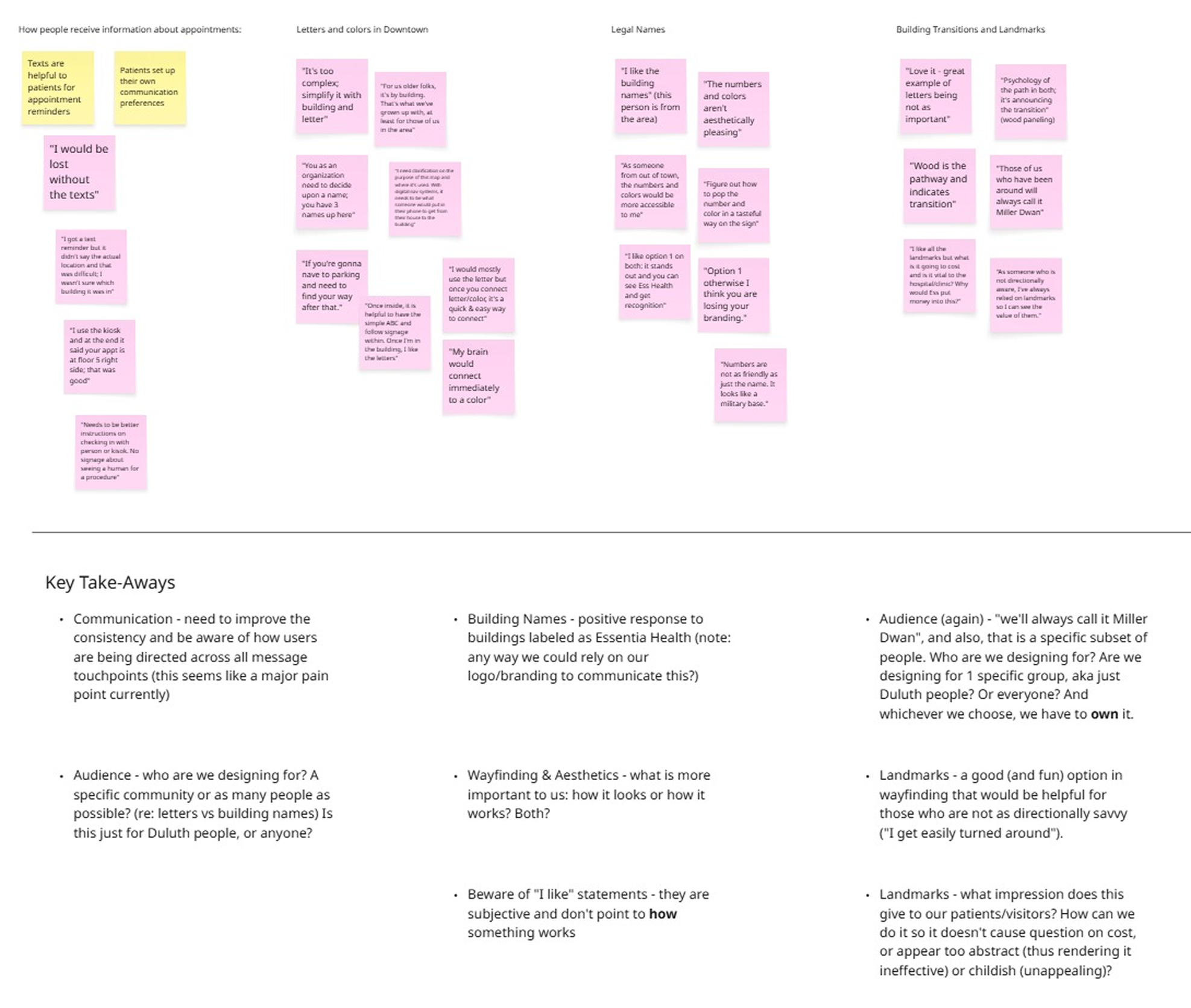 Seeing this as the direction of the Patient & Visitor Focus Group was disheartening from a UX Research standpoint, as the questions were not focused on examining and understanding how users think about wayfinding or experience it. This felt like a lost opportunity. Nonetheless, I gathered what insights I could, and particularly listened for any statements that pointed towards how users felt.