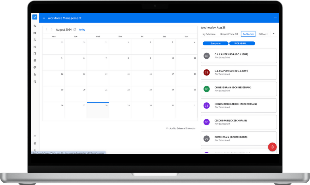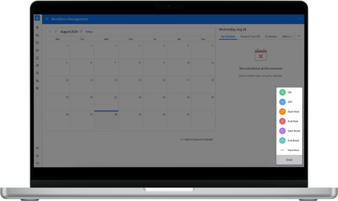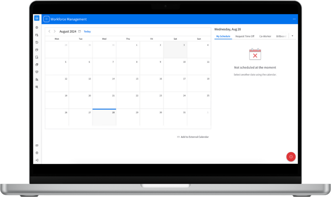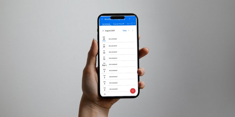 The WFM mobile application is a digital tool for shift-based employees who need to manage their work. The primary action is clocking in and out for shifts to log time worked, but also includes checking schedules, requesting time off, swapping shifts with coworkers and more.