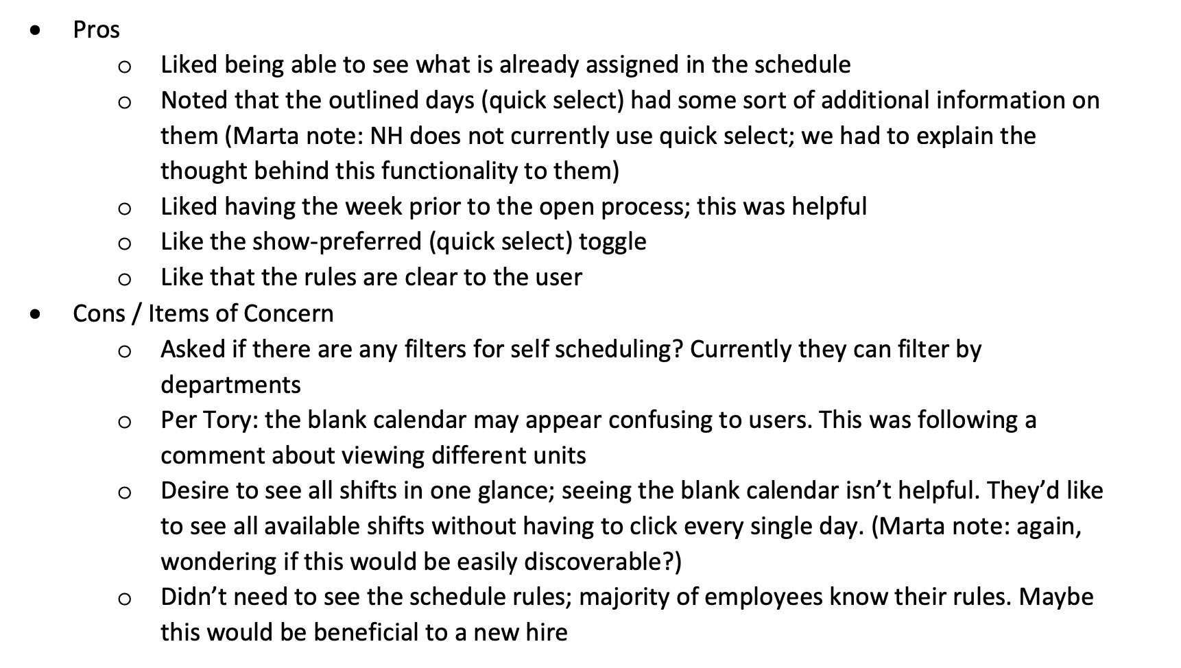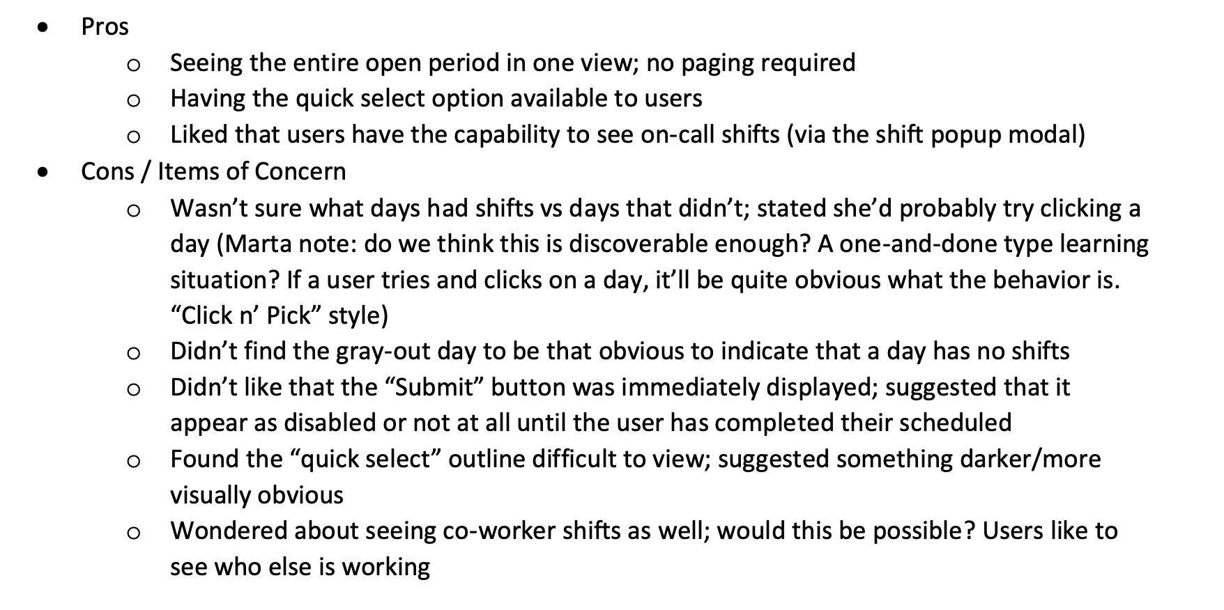 With the core of our designs completed, we tested the critical process of Self Scheduling with end users and customers. This process allows individual employees to self-manage their own schedule, and is a highly sought-after process when it becomes available. We gathered feedback on our designs to ensure the improvements were intuitive for end users to understand, and to identify any gaps.