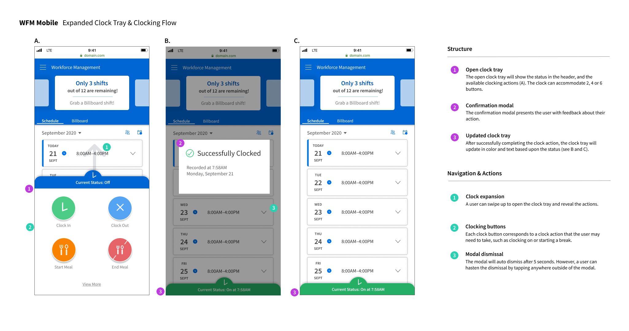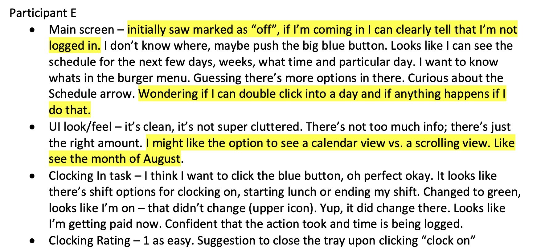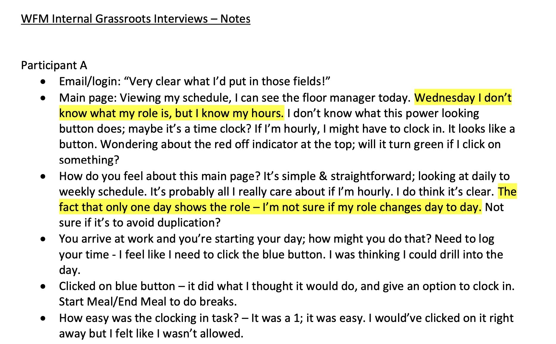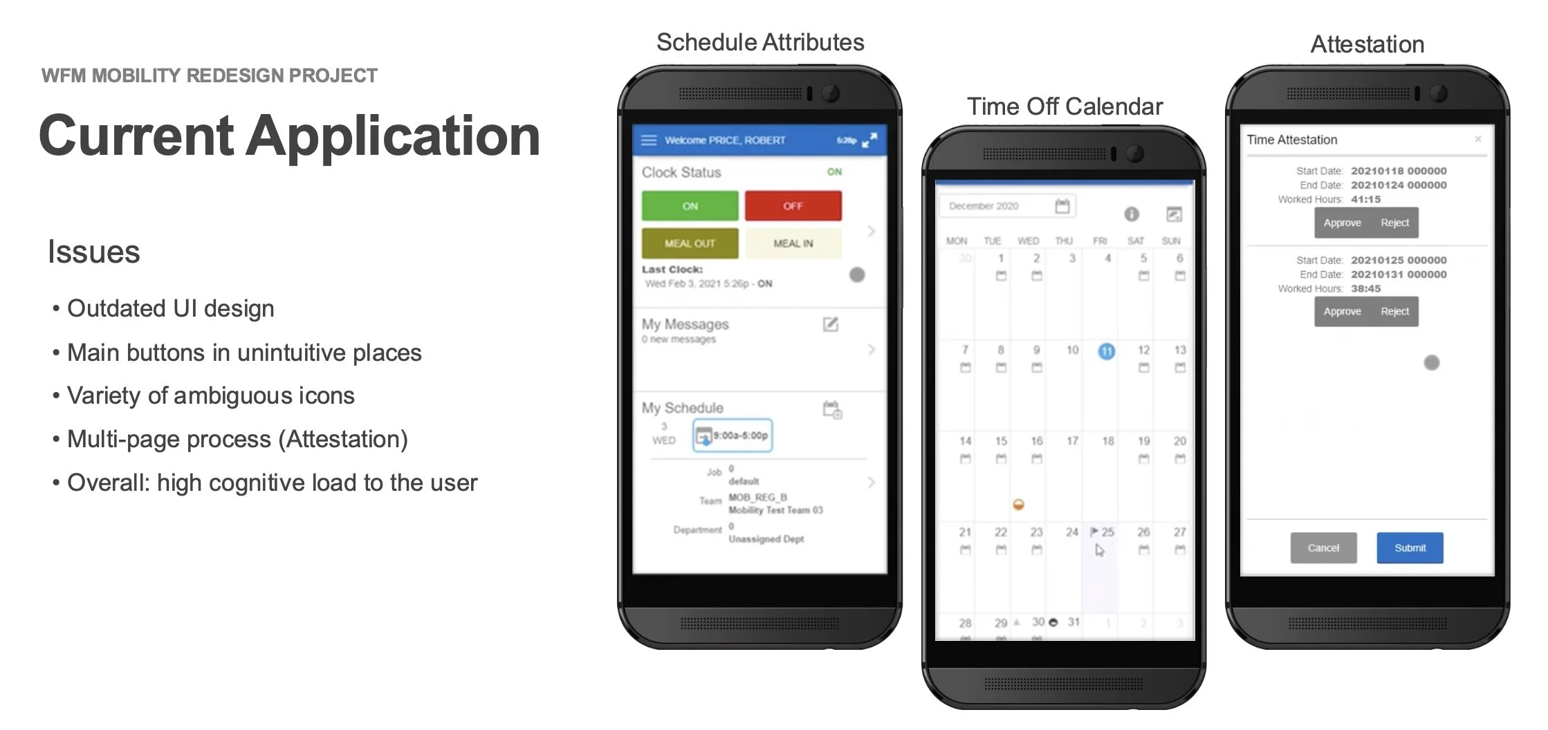 Scope: redesign the main mobile experience for WFM (clocking on/off, requesting time off, scheduling, etc) to be more modern, intuitive, and user-friendly