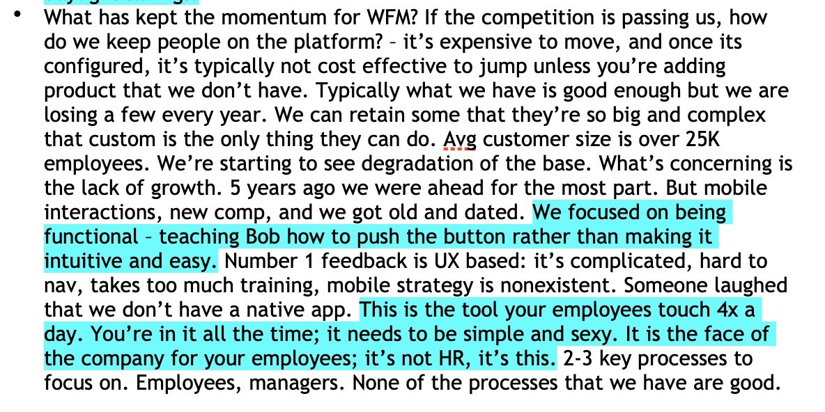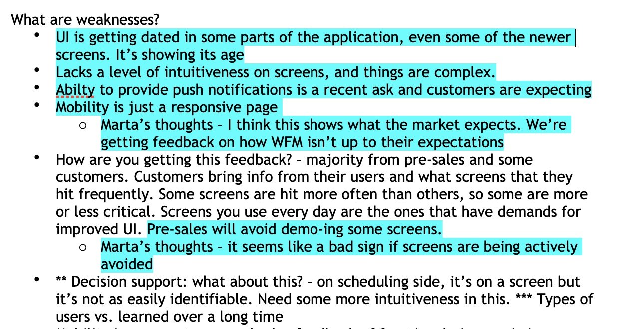 The project began with several interviews with 9 stakeholders, including Sales, Development Leaders, and customers. In speaking with these individuals about the product, my team was able to gain insight into what was advantageous about the WFM product and what was a challenge.