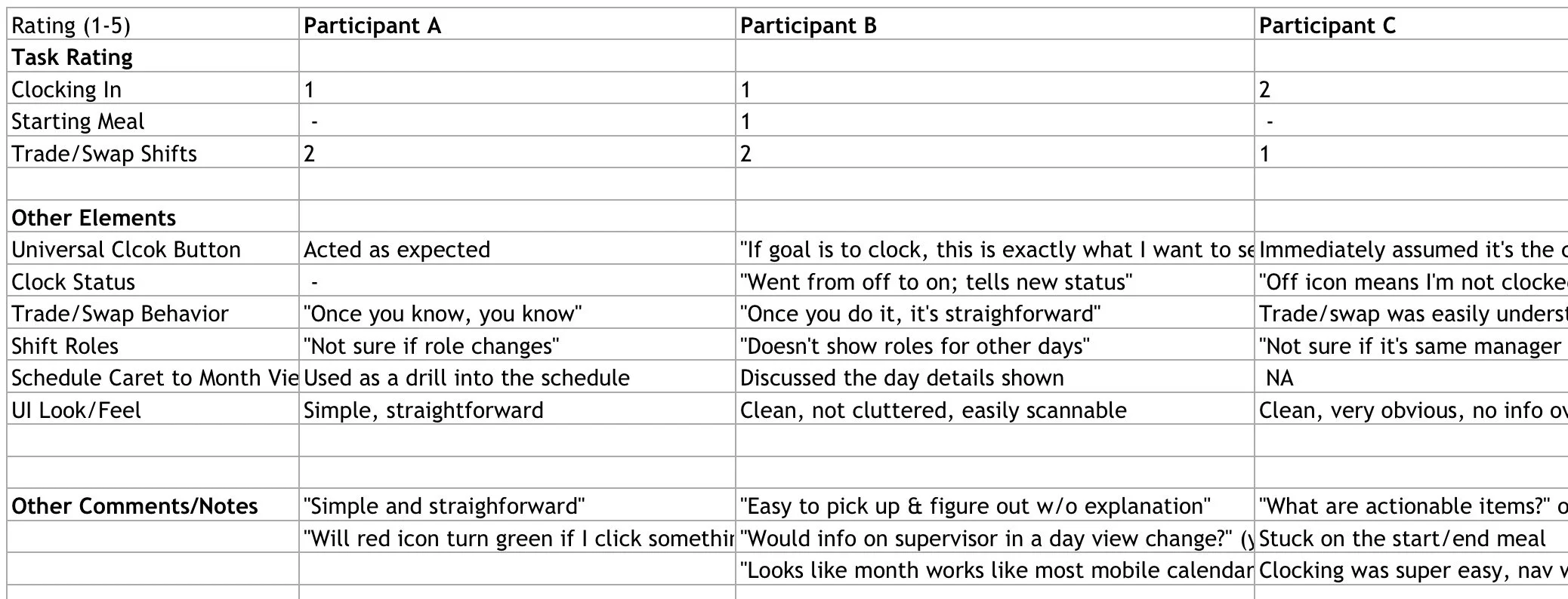 We collaborated with 11 internal colleagues who were not directly familiar with the WFM product. Notes were collected in each session, and we had our test users rate on a scale of 1-5 how easy or difficult a task was to complete (1 being easy, and 5 being difficult).